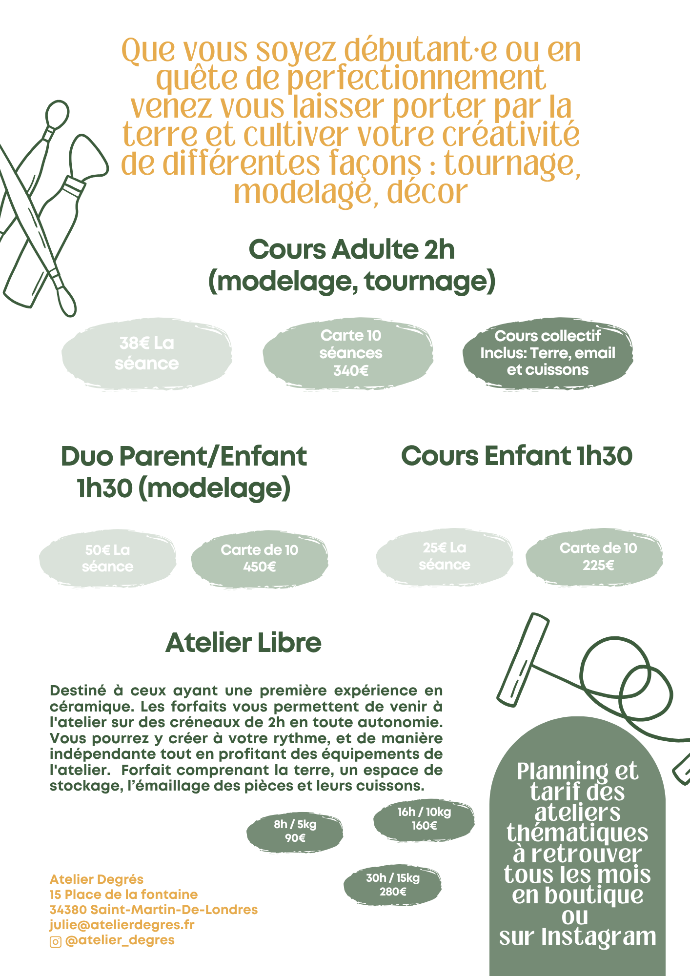 Les tarifs comprennent la terre, les émaux, les outils et les cuissons.
