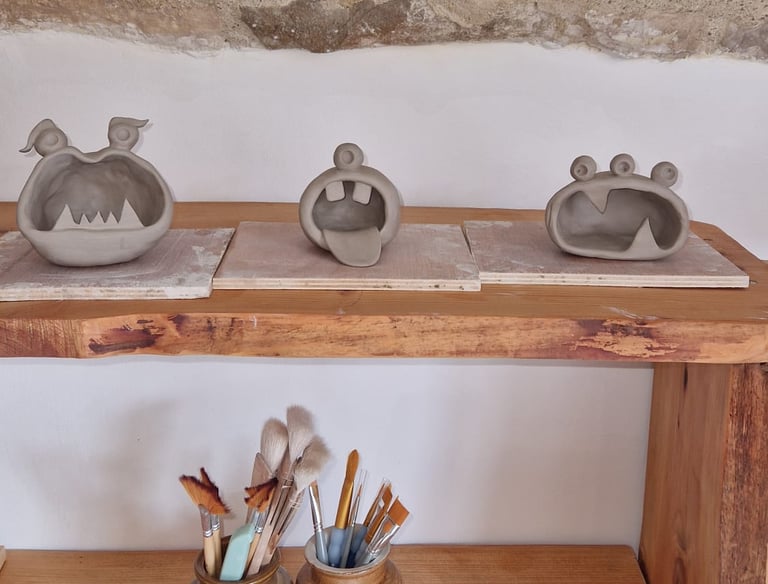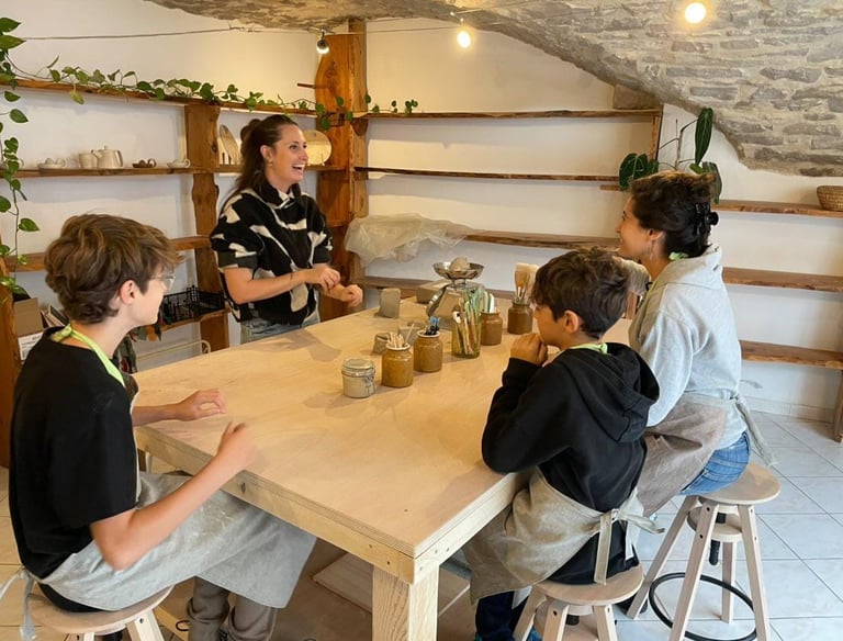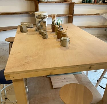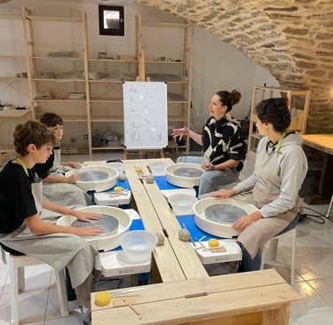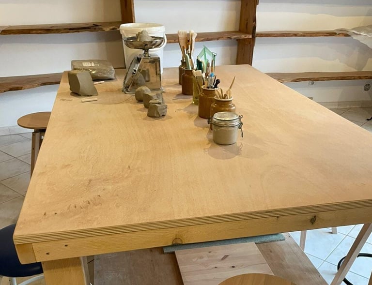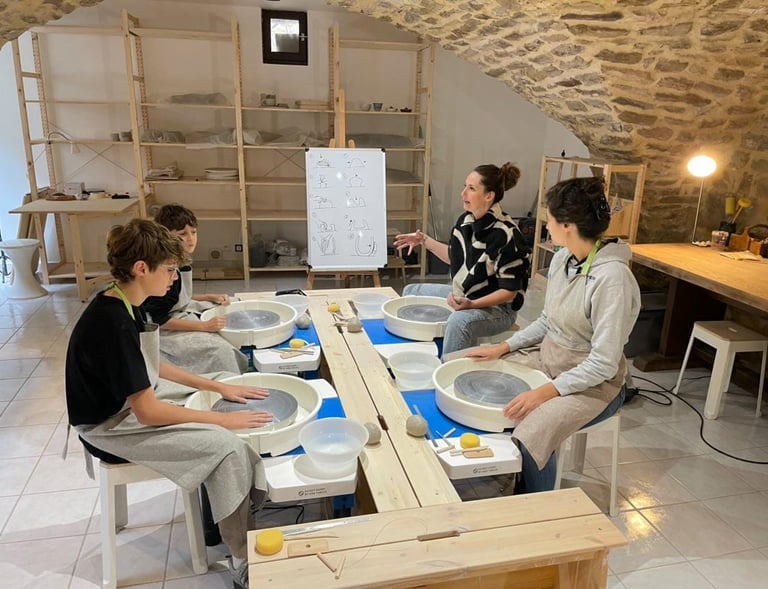 L'atelier dispose de quatre tours de potier, d'un four, d'une grande table dédiée au modelage et de tout le matériel nécessaire pour donner vie à vos créations.